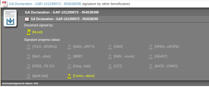Hello Ronny, We aren’t able to sign the DoH. We never got the email from the Commission. If you check it says “No authorisation”. [cid:image001.png@01DC9C28.FCD64D00] Cheers Tryfon From: Ronny Lam <ronny@nlnet.nl> Sent: 12 February 2026 13:21 To: restack@lists.nlnet.nl Subject: [Restack] Re: Mailing list for Restack Hi All, and welcome to the list. On 2/9/26 18:27, Michiel Leenaars wrote: In terms of grant preparation: we will be transferring the project plan into the EC portal as usual. Meanwhile every organisation has to sign the Declaration of Honour. We'll reach out soon to schedule a kickoff meeting. If you run into anything, contact Ronny Lam (ronny@nlnet.nl<mailto:ronny@nlnet.nl>). [cid:image002.png@01DC9C28.FCD64D00] Most signatures are still missing on the declaration of honour. Can you all have a look at it and sign it? It seems that most of you have been asked to deliver their financial statements. Don't make the mistake that I made and think that you have to stress to deliver the 2025 financial year. Nobody can expect you to have that ready so soon. So the 2024 financial year is fine. Self-declaration is also fine. If you need an example for that, please send me a mail. Regards, Ronny.